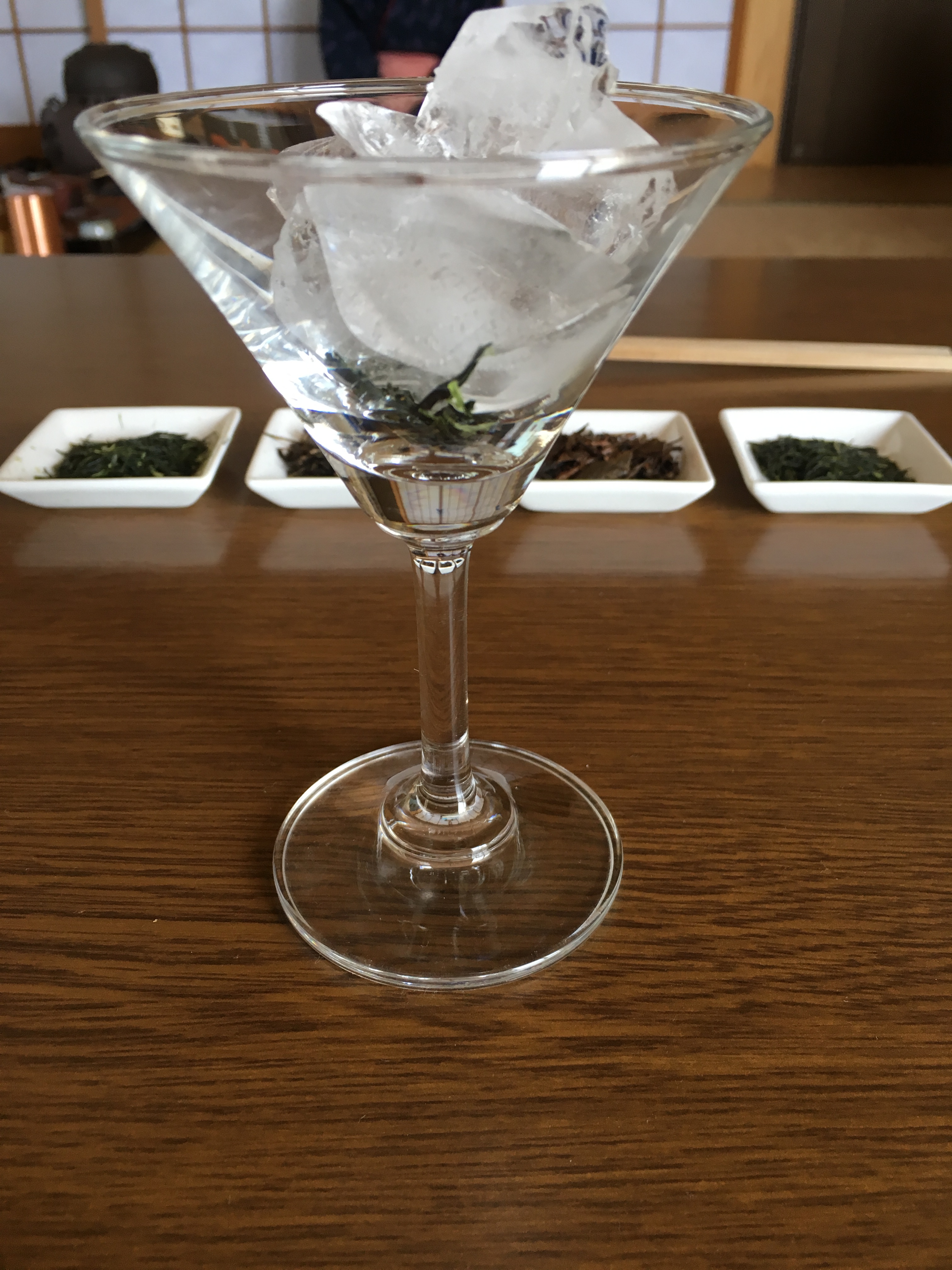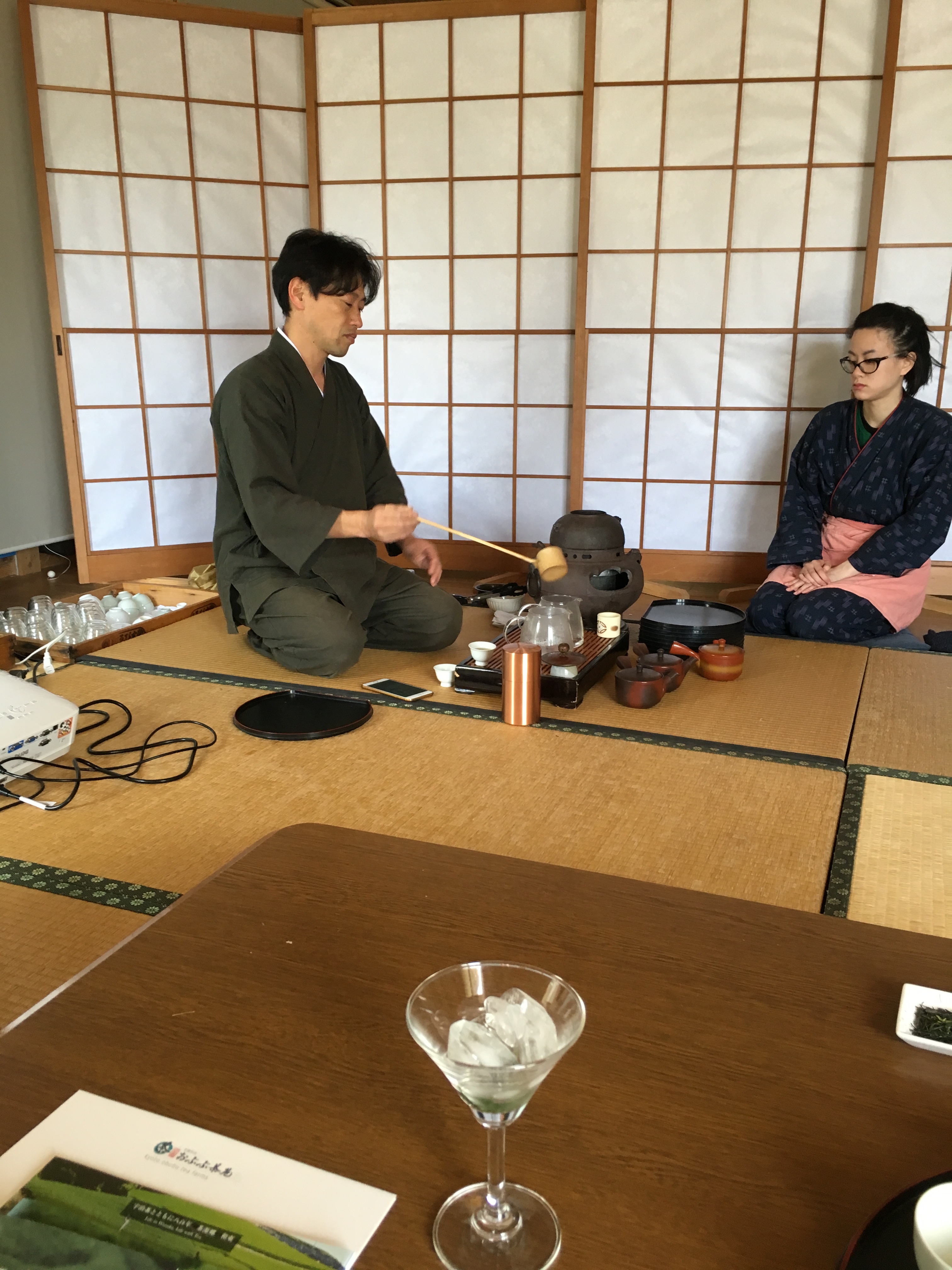 After the tour, we went back to the tatami room. We were treated to many samples of different teas. Hojicha, kukicha, wakocha, sencha, and even matcha that we got to whisk ourselves. They served us a lovely kooridashi sencha, which is sencha leaves in a glass with ice placed on top. This is a lesser known way of making an iced tea. You simply put sencha leaves in the bottom of a glass and wait for the ice to fully melt. It may take longer to make, but the resulting tea is much richer and fuller in flavor and mouthfeel. We were also given a tea in a hohin, a brewing vessel that is not unlike the traditional Chinese lidded gaiwan. We were to serve the tea in tiny cups, alternating between them to insure that the flavor was equally strong in each. We were also taught that you can eat spent sencha leaves, in much the same way you would a salad. We ate the leaves mixed with soy sauce and genmai puffed rice.